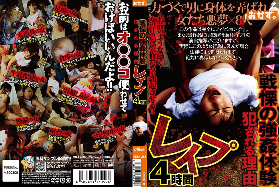 戦慄の強姦体験 犯される理由 レイプ 4時間 悲鳴・抵抗・逃亡!!それでも迎える悲惨な結末!!脅され凄まれ押し倒されて…受け入れられない現実…この男は誰?なぜこの私にこんな仕打ちを!?それでも決して身体は許すまいと必死だった…私を見下して下卑た笑みさえ浮かべて…剥き出しになった下半身は怒張した肉棒を震わせて…私はこうして犯された…女姦禁×12人 出演女優 働く女8人 監督 レーベル おかず。 ジャンル レイプ凌辱職業色々輪姦鬼畜系 発売日 2018/4/27 品番 OKAX-368 メディア DVD 収録時間 240分 定価 1,980 円(税抜) 作品を購入する FANZA で購入Amazonで購入
