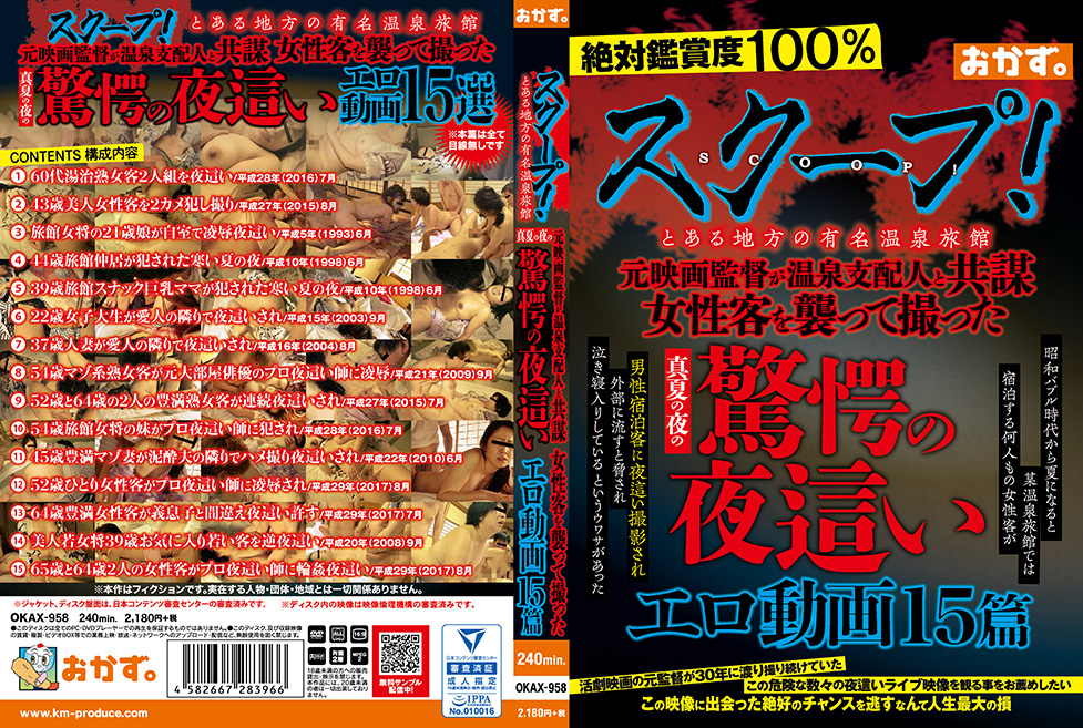 とある地方の有名温泉地では昔から妙なウワサがあった!昭和のバブル時代から30年以上、夏になると某温泉旅館では宿泊する何人もの女性客が男性宿泊客に夜這いされ撮影され、被害者の女性客は訴える事もなく、泣き寝入りしているというものだった。その実態を探ろうと潜入した週刊誌の記者が行方不明になっているという。令和になってコロナ禍で某温泉旅館は倒産し、それらの夜這い映像が流出して、闇ルートで高額で取引されていた。元アクション映画監督が温泉旅館の支配人と共謀して熟女客の部屋に合鍵で忍び込み、プロ夜這い師に夜這い凌辱をさせて撮ったという驚愕の夜這いエロ動画15篇を㊙公開。20代~60代の素人女性たち18人のリアルな夜這いライブが堪能できます!!